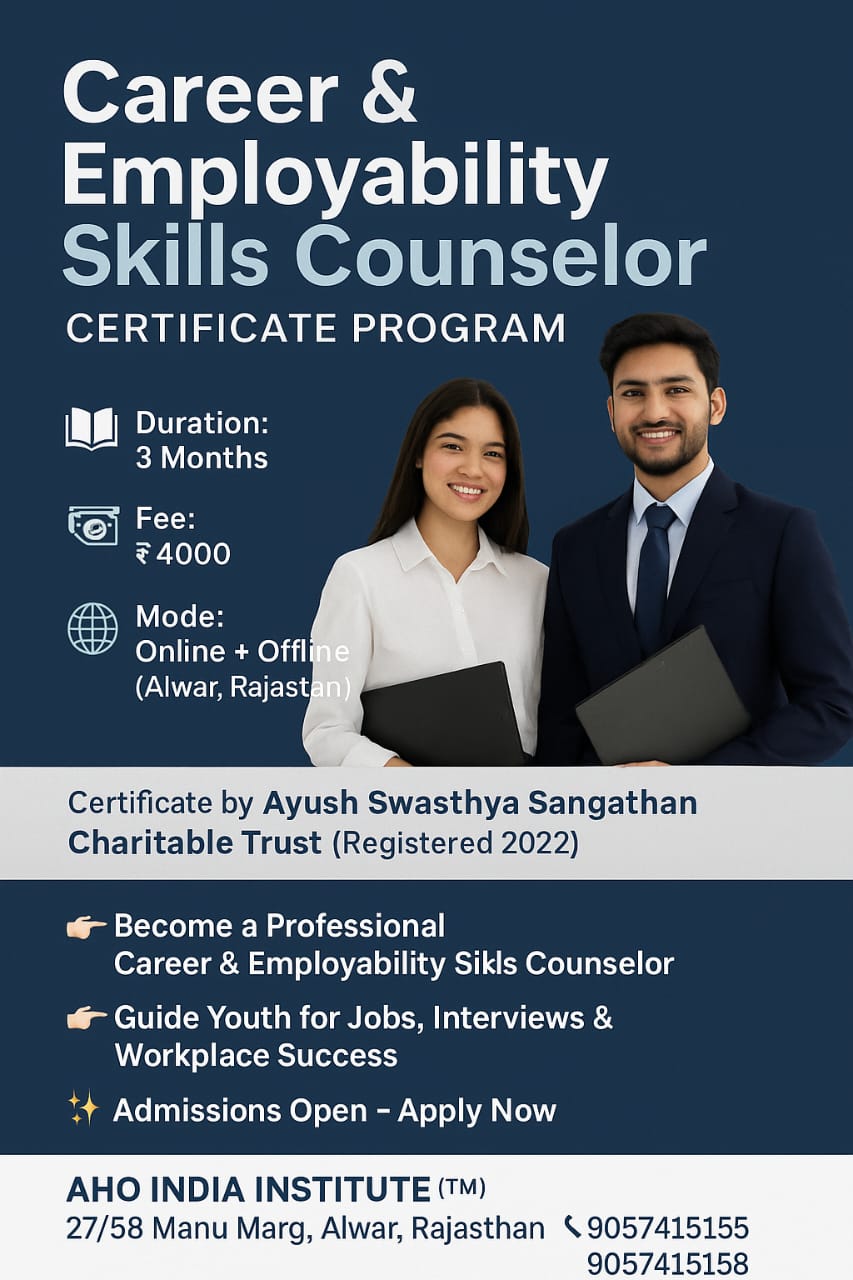 With AHO India’s Employability & Life Skills Counselor Program, you’ll gain expert training to guide others in developing essential soft skills, improving job prospects, and achieving personal and professional growth.